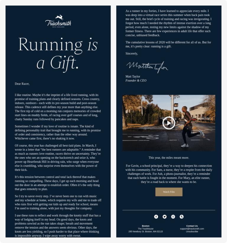 Tracksmith’s newsletter employs a timeless tool of the email trade. Under the headline “Running is a Gift,” the chief executive reflects personally about enjoying every step as a man in his forties who runs. This touching message comes as the preamble to a movie about the power of running.